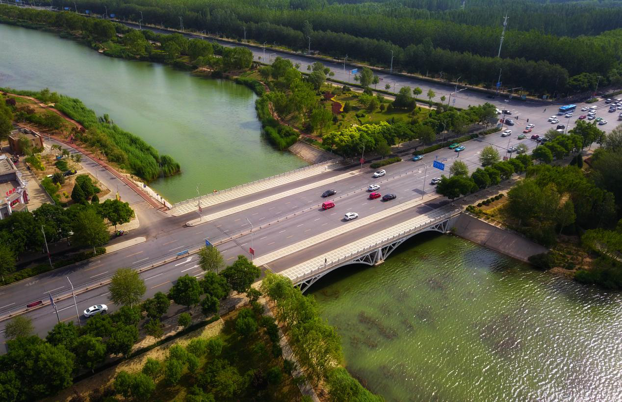 2003年,典农河水系连通工程开建,原先从这一带穿过的银新干沟和四二干沟,在水系连通治理中,融入水域规模更大的典农河景观水系。与此同时,随着金凤区建设的启动,上海路正源北街口至满城街口的道路工程也快步推进,使这条之前已从唐徕渠之东延伸到正源街的城市主干道继续向西延伸。作为此次道路工程重要节点的双狮桥,也是在这一时段完成了建设。